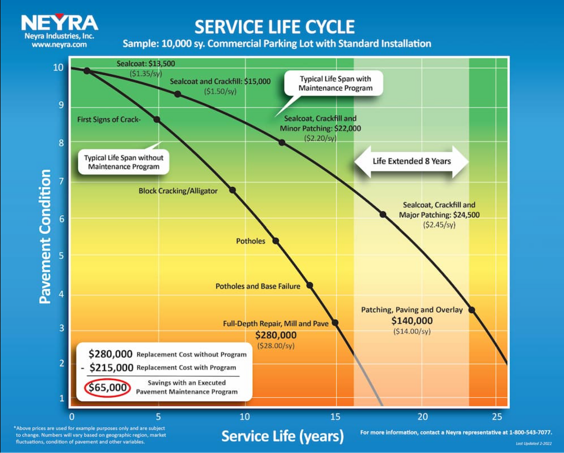 Seal Coating is a thin coat application applied to aged asphalt. There are two main features of this product. First, the sealer restores the wearing course. The oils in the sealer penetrate the existing asphalt, replacing the original petroleum lost through oxidation. We also mix our sealer with silica sand, so the sand will help fill in small voids where stones have come loose, and also fill in small spots where the wearing course has started to deteriorate. Deterioration is a natural part of the life cycle of bituminous asphalt; the sun's ultraviolet rays oxidize the asphalt, causing the binder course to lose its resiliency. This results in the formation of cracks and potholes. It is important to note that sealer will not completely fill all cracks or holes in the asphalt; rather it acts as a binder to retard further deterioration. When sealer is applied, the sealer itself becomes the wear surface thereby reducing the wear experienced by the asphalt surface below.